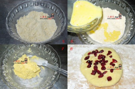 原料:高筋面粉125g、黄油35g、蔓越莓干15g,白砂糖15g,牛奶60g